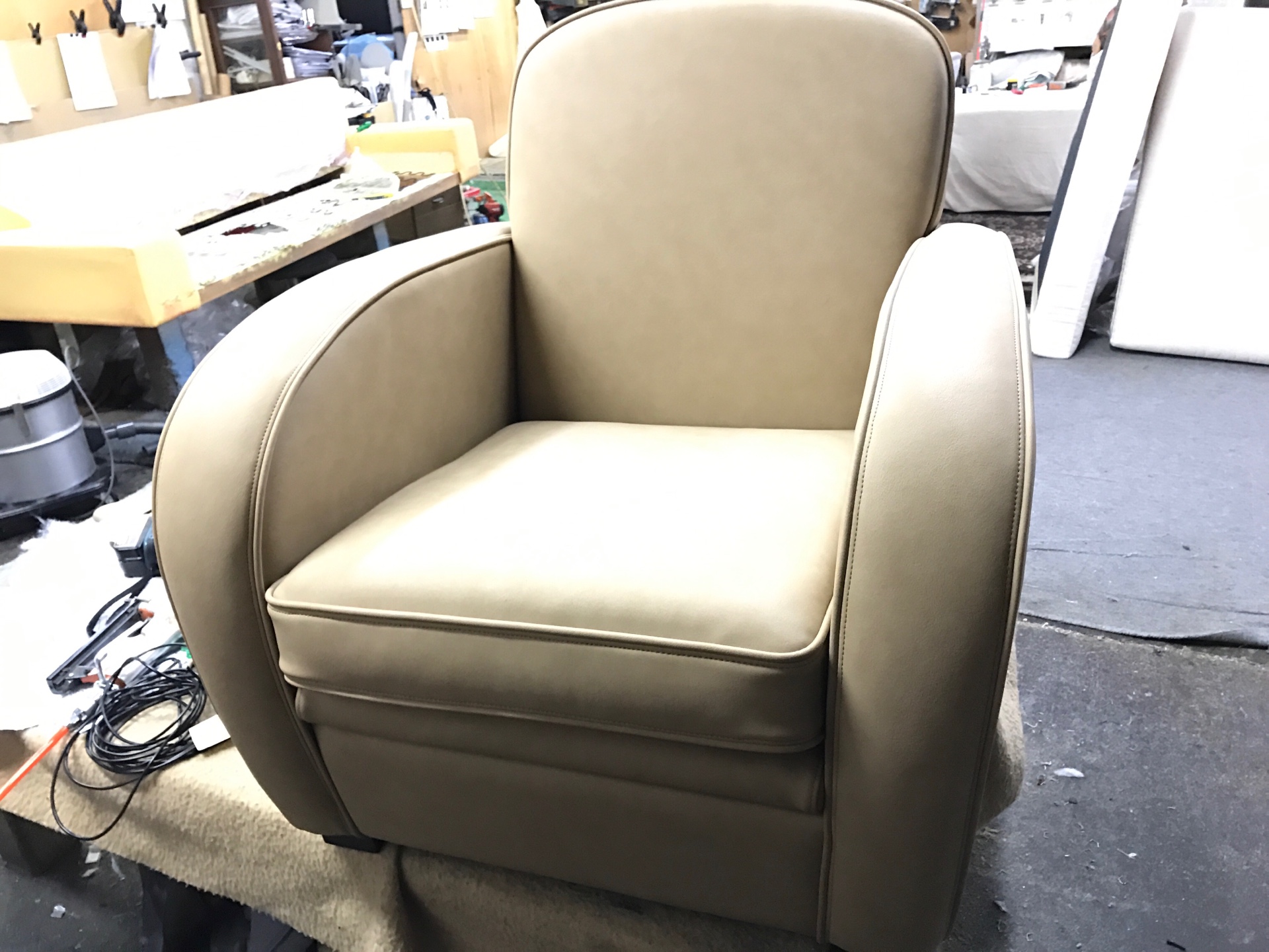 今回は、張地がビニールレザーのアームチェアを張替えました。 肘掛けの部分などレザーが剝がれてしまっている箇所が幾つかあります。 アイボリー系のビニールレザーに張替えて印象も明るくなりました。 アップステアー […]